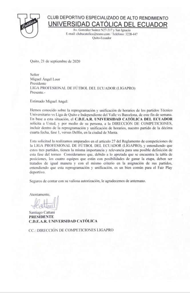 La dirigencia de Universidad Católica solicita a Liga PRO que se unifique también el encuentro en el que enfrentarán a Delfín.