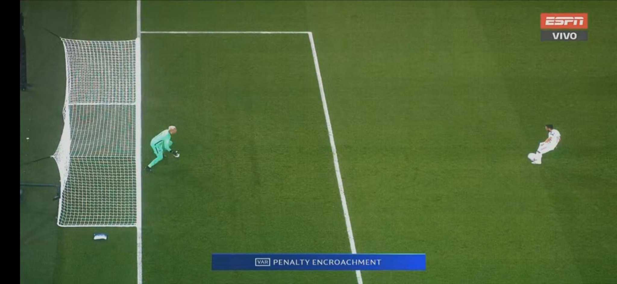 En primera instancia, Keylor Navas adivinó la trayectoria del remate de Bruno Fernandes pero el VAR determinó que el arquero tico tenía los dos pies adelante de la línea antes del cobro por lo que se repitió.