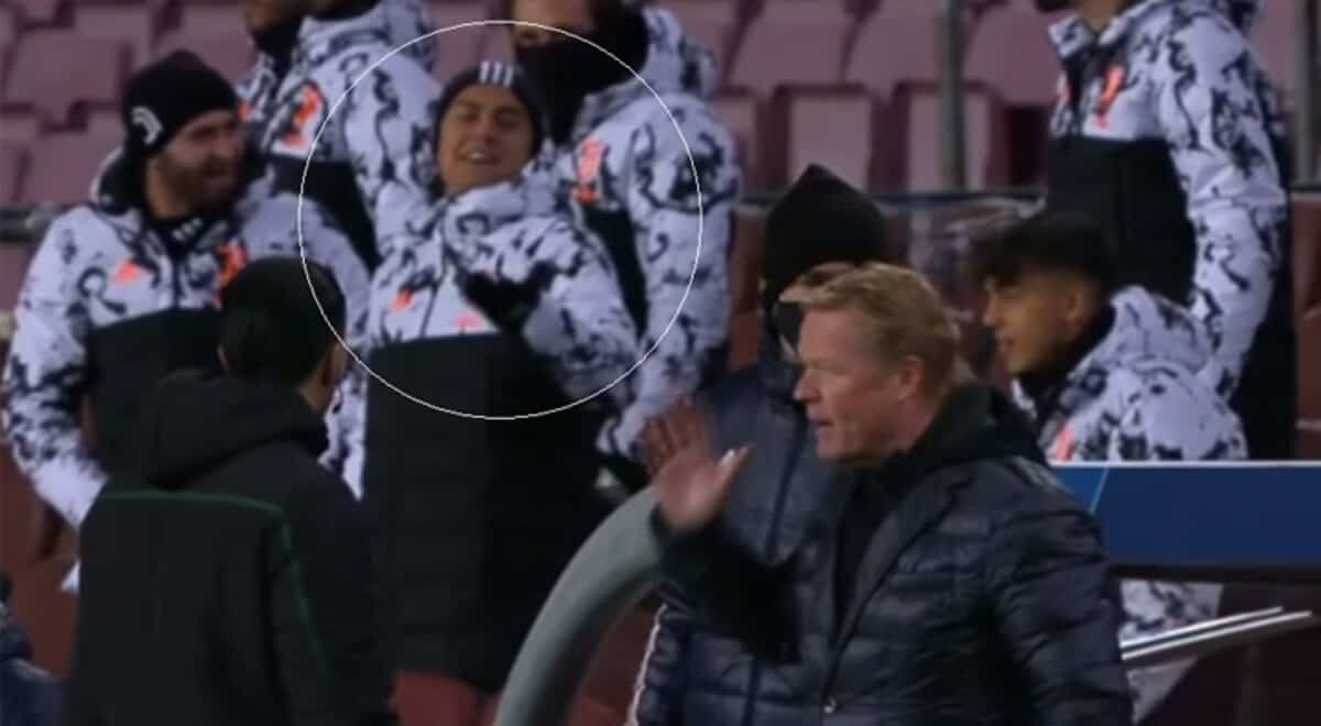 Tras cometer Lenglet una pena máxima por manos, los suplentes de la Juventus no se quedaron conformes con la revisión de VAR que permitió decretar el penalti, sino que también pedían la segunda amarilla para el central galo, lo que no gustó a Koeman. El técnico holandés se enfadó con las que consideraba unas protestas desorbitadas y tuvo sus más y sus menos con el banquillo de la Juventus, que le replicó. En ese momento, las cámaras captaron cómo Paylo Dybala se dirigía a Koeman riéndose de él haciendo al mismo tiempo el señal del VAR. El mediapunta argentino logró la complicidad de sus compañeros, que se lo pasaron en grande con la mofa del ex del Palermo con el técnico azulgrana.
