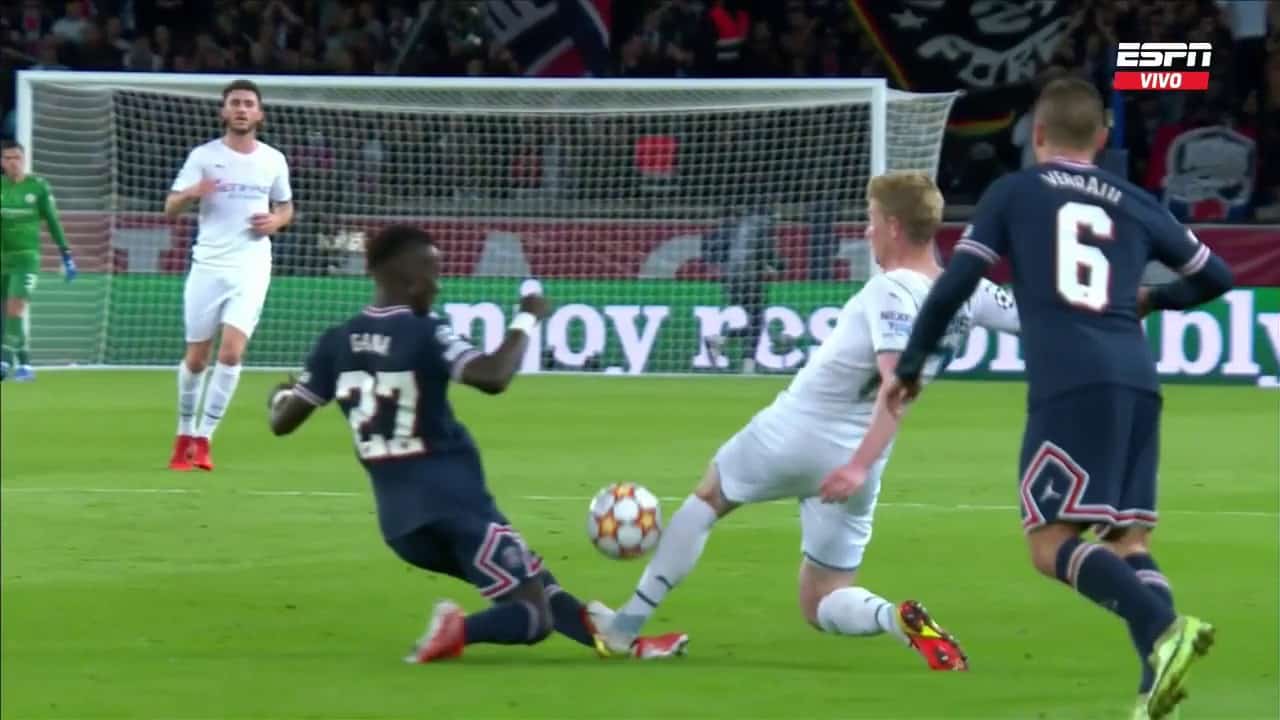 El Manchester City la sacó barata sobre el final del primer tiempo ante el PSG en París. Kevin De Bruyne, mediocampista ‘citizen’ cometió una durísima infracción sobre Idrissa Gueye.