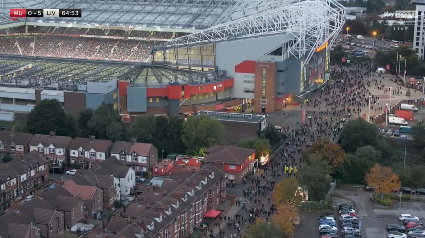 Histórica paliza en Old Trafford la que le propinó Liverpool al Manchester United. Fue 5-0, por la 9° fecha de la Premier League, con tres de Mohamed Salah, más uno de Naby Keita y otro de Diogo Jota. Pero lo curioso fue la imagen que se vio en la transmisión del partido cuando aún faltaba más de media hora para su final: ¡gran cantidad de gente comenzó a dejar el estadio!