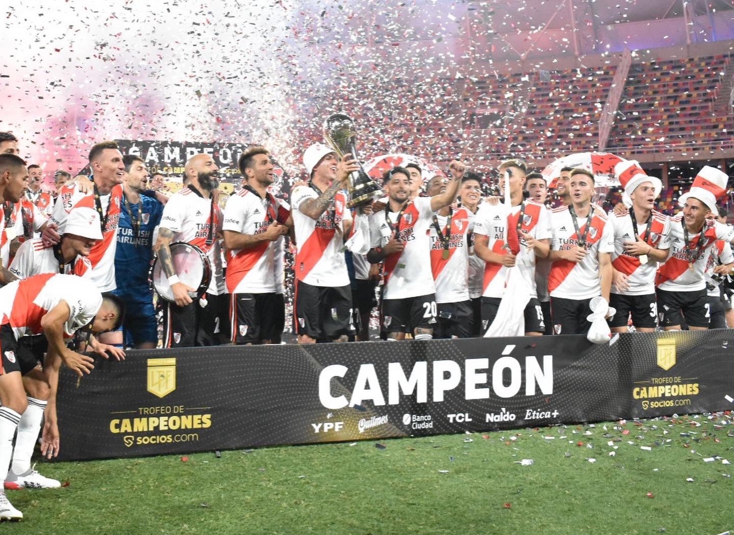 Con dos goles de Julián Álvarez, uno de Benjamín Rolheiser y el restante del colombiano Jorge Carrascal, el ‘Millonario’ sumó la tercera corona del año tras haber conquistado la Supercopa Argentina, el Torneo de la Liga Profesional y este Trofeo de Campeones.