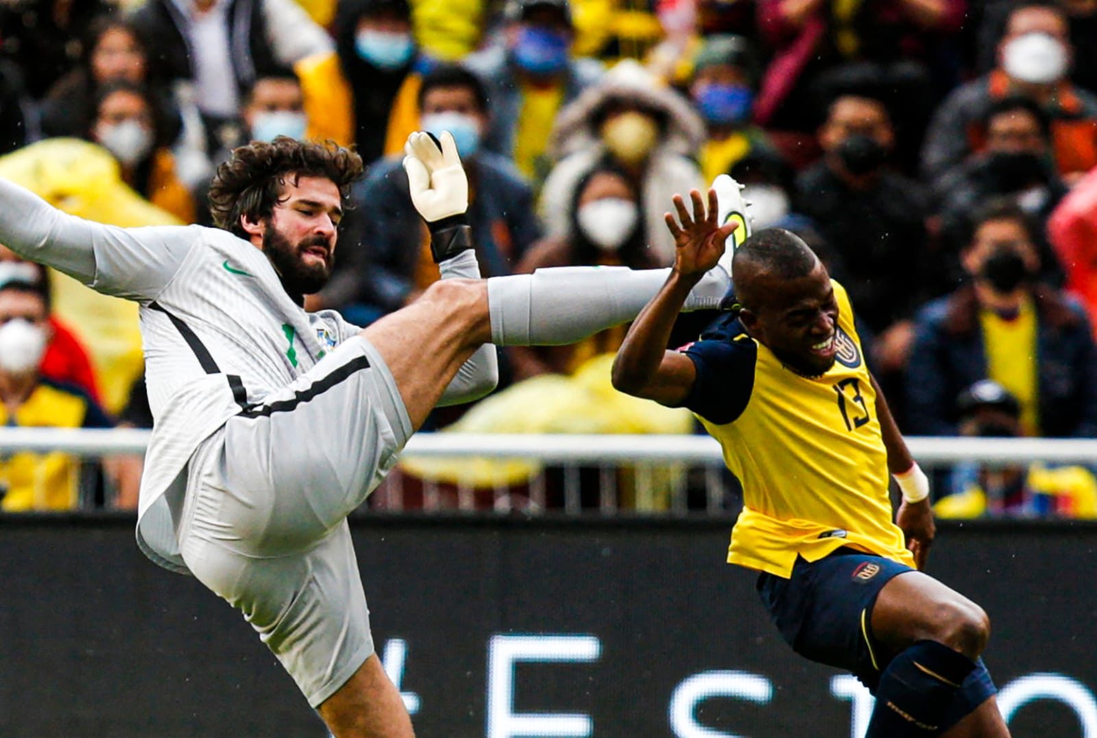 Luego, el arquero Alisson Becker fue con exceso de vehemencia a despejar una pelota y terminó impactando a Enner Valencia.