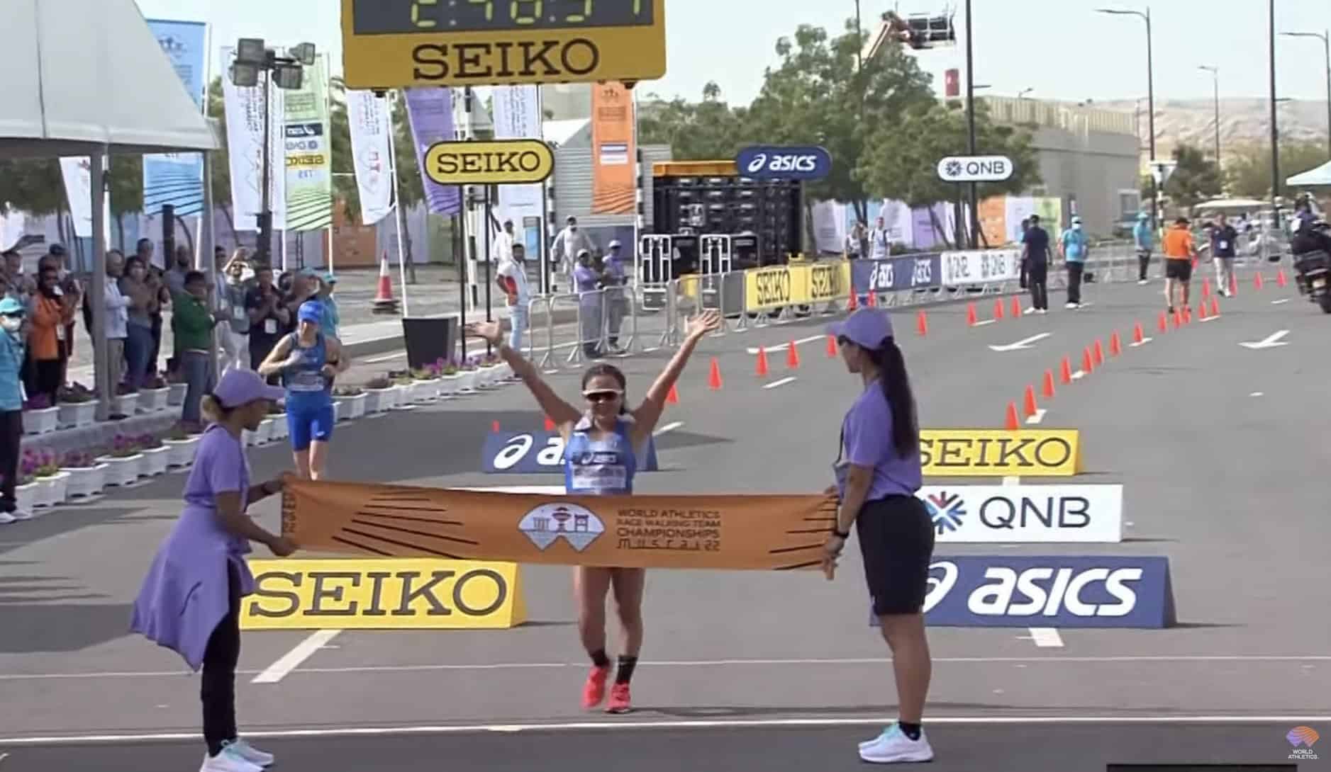 Glenda Morejón cruza primera la meta en la prueba de 35 km en el Campeonato Mundial de Marcha por Equipos en #Muscat