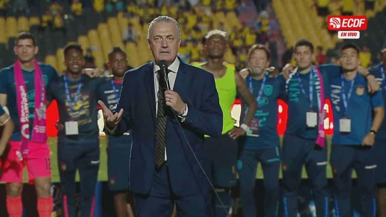 “Nadie creía en Ecuador y hoy está de pie y dice presente al mundo. Es el inicio de algo muy importante. Vamos a luchar por hacerlo felices”, continuó el entrenador que dejó la voz en el discurso.