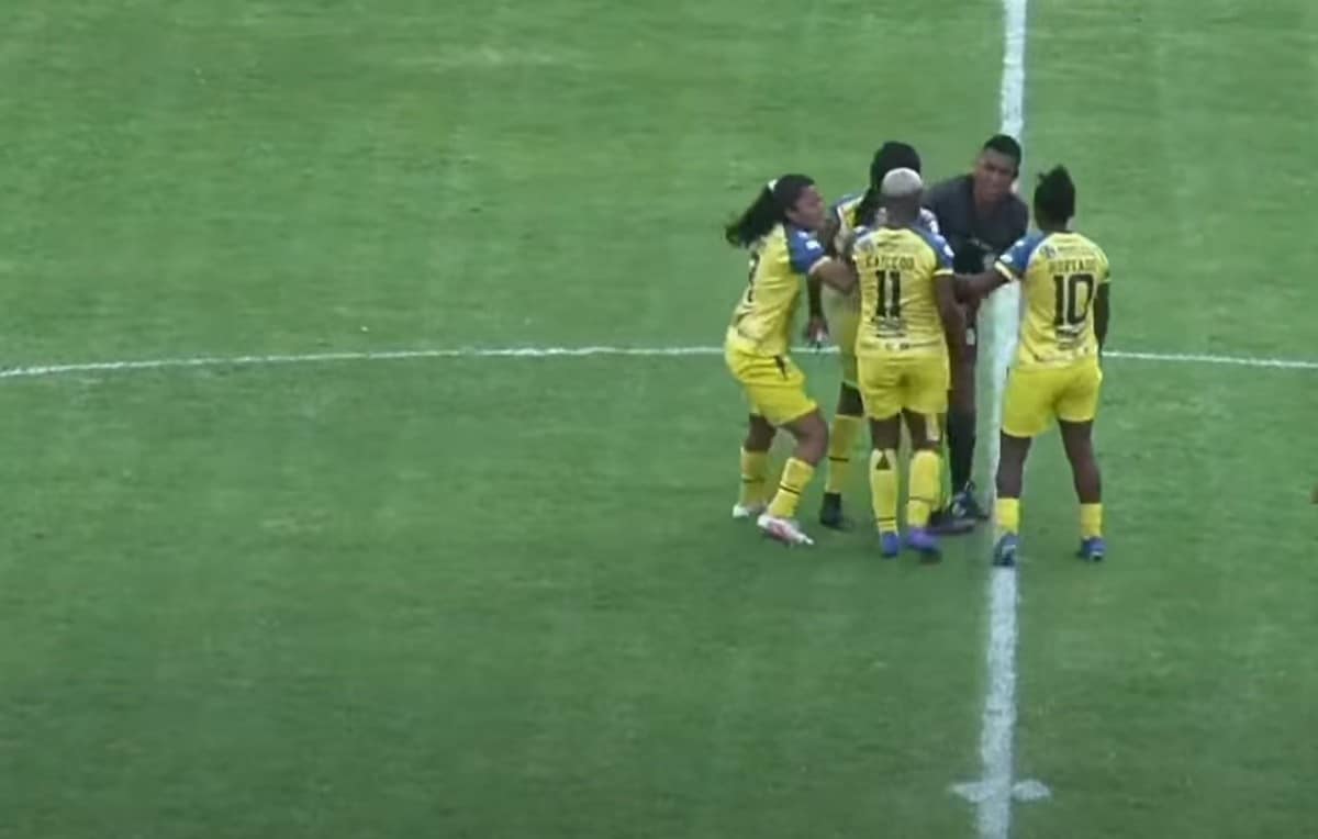 Una jugadora cree que su expulsión es demasiado rigurosa, no la acepta y acaba agrediendo al árbitro al propinarle una patada en sus partes nobles enojada por esa decisión arbitral. La jugadora es Shirley Caicedo, del Club Deportivo Leones del Norte de Ecuador.