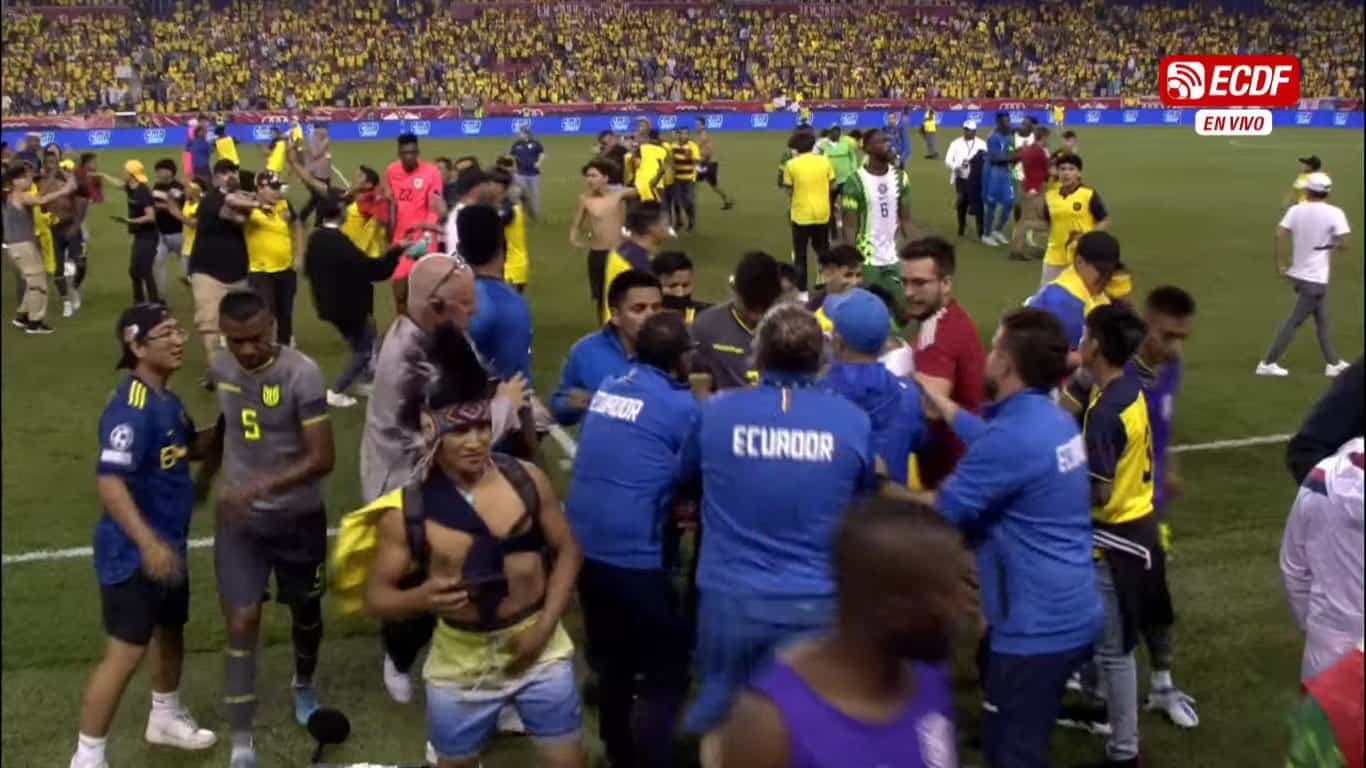 Luego del pitazo final del partido entre Ecuador y Nigeria, decenas de aficionados ecuatorianos invadieron el campo de juego del estadio Red Bull Arena.