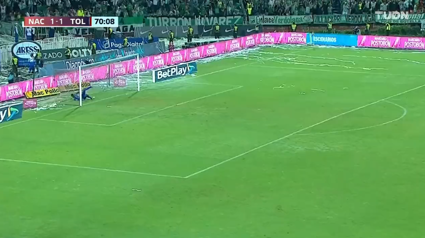 Minutos después volvieron a sorprender al arquero ecuatoriano. El mismo Yerson Candelo recuperó la pelota en zona de Atlético Nacional, cuando midió, vio a Domínguez adelantado, avanzó unos metros y soltó el preciso remate desde la mitad de la cancha que hizo ‘explotar’ el Atanasio Girardot.