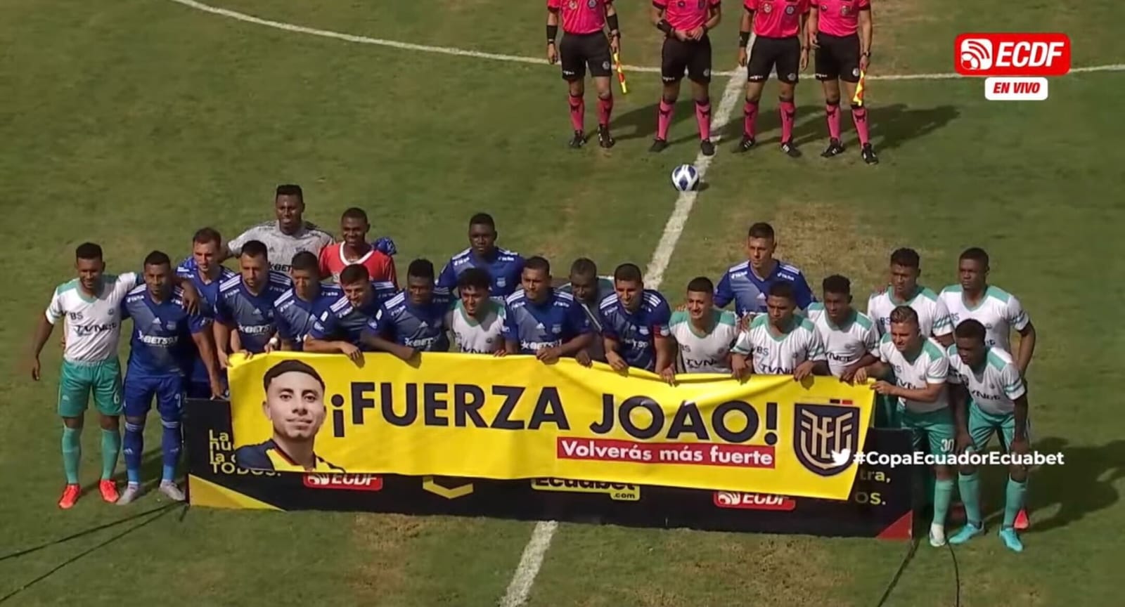 Los jugadores de ambos equipos salieron con un cartel en apoyo al extremo ecuatoriano de 24 años de edad, el cual decía ¡FUERZAS JOAO!