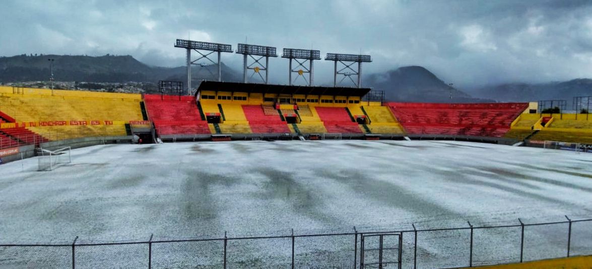 La cancha del Estadio Gonzalo Pozo Ripalda, propiedad de Sociedad Deportiva Aucas, se pintó de blanco tras la granizada que cayó en el sur de Quito.