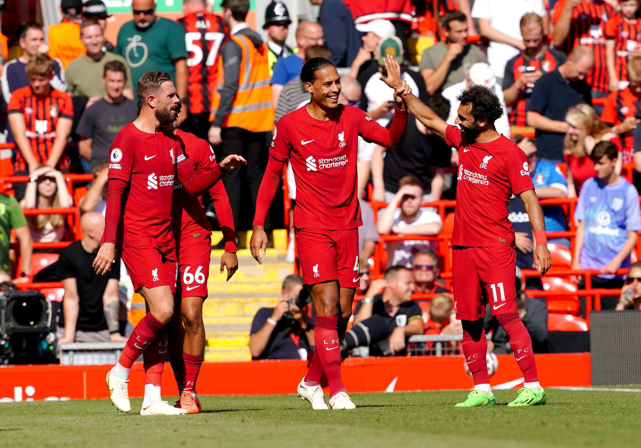 Los otros goles fueron anotados por parte de L. Díaz (x2), H. Elliott, A. Arnold, V. Van Dijk, un autogol de C. Mepham y F. Carvalho.