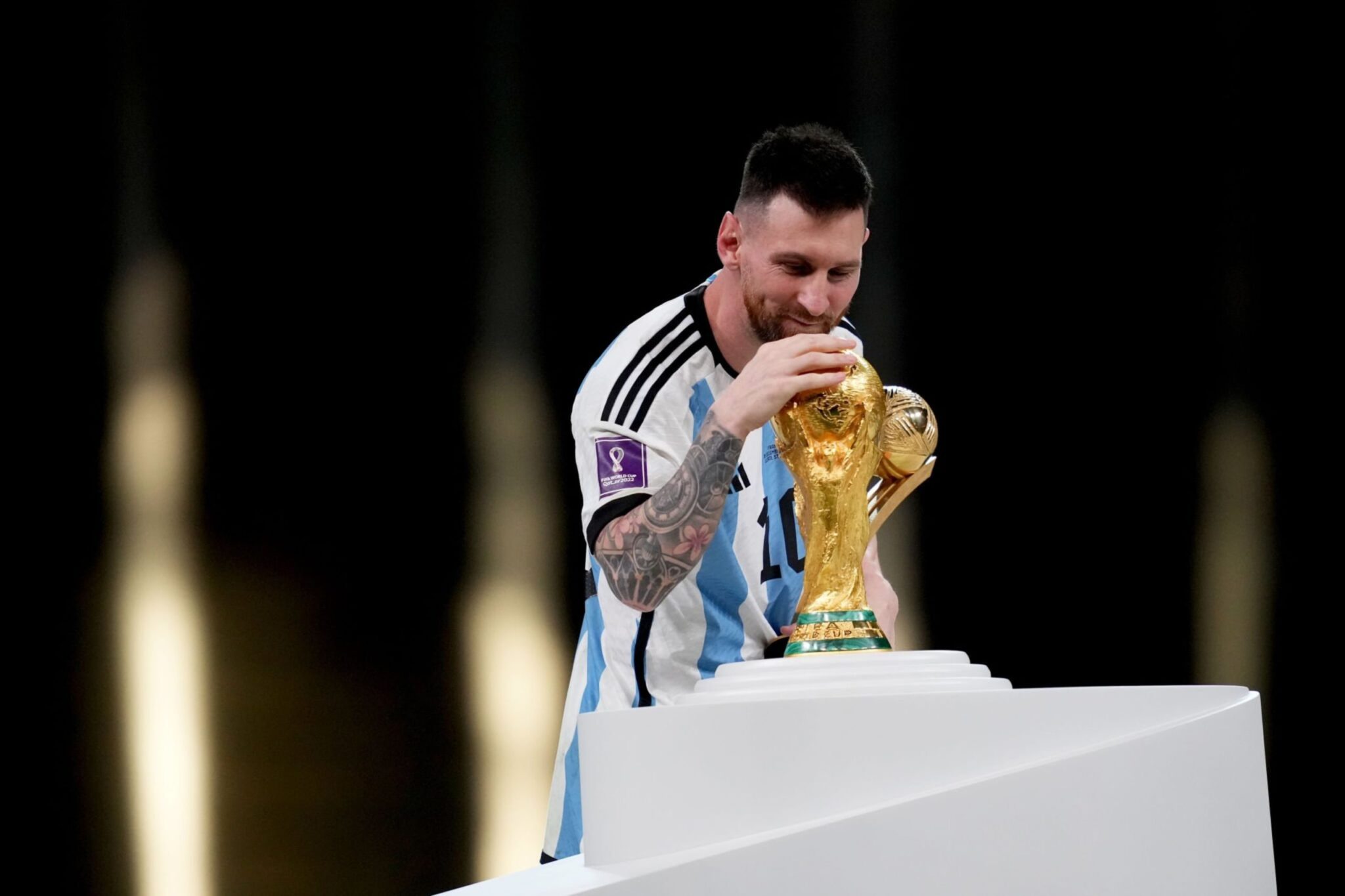 Durante la premiación, antes que se levante la copa, el mejor jugador del mundo se acercó al trofeo, lo tocó y lo besó.