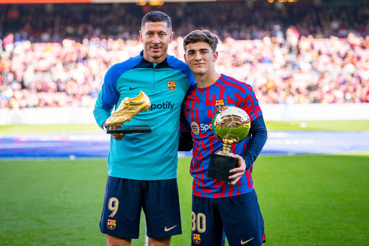 Con ustedes, el Golden Boy y Bota de Oro del año. Gavi y Robert Lewandowski mostraron sus respectivos premios ganados en esta temporada a la afición presente en el Camp Nou.