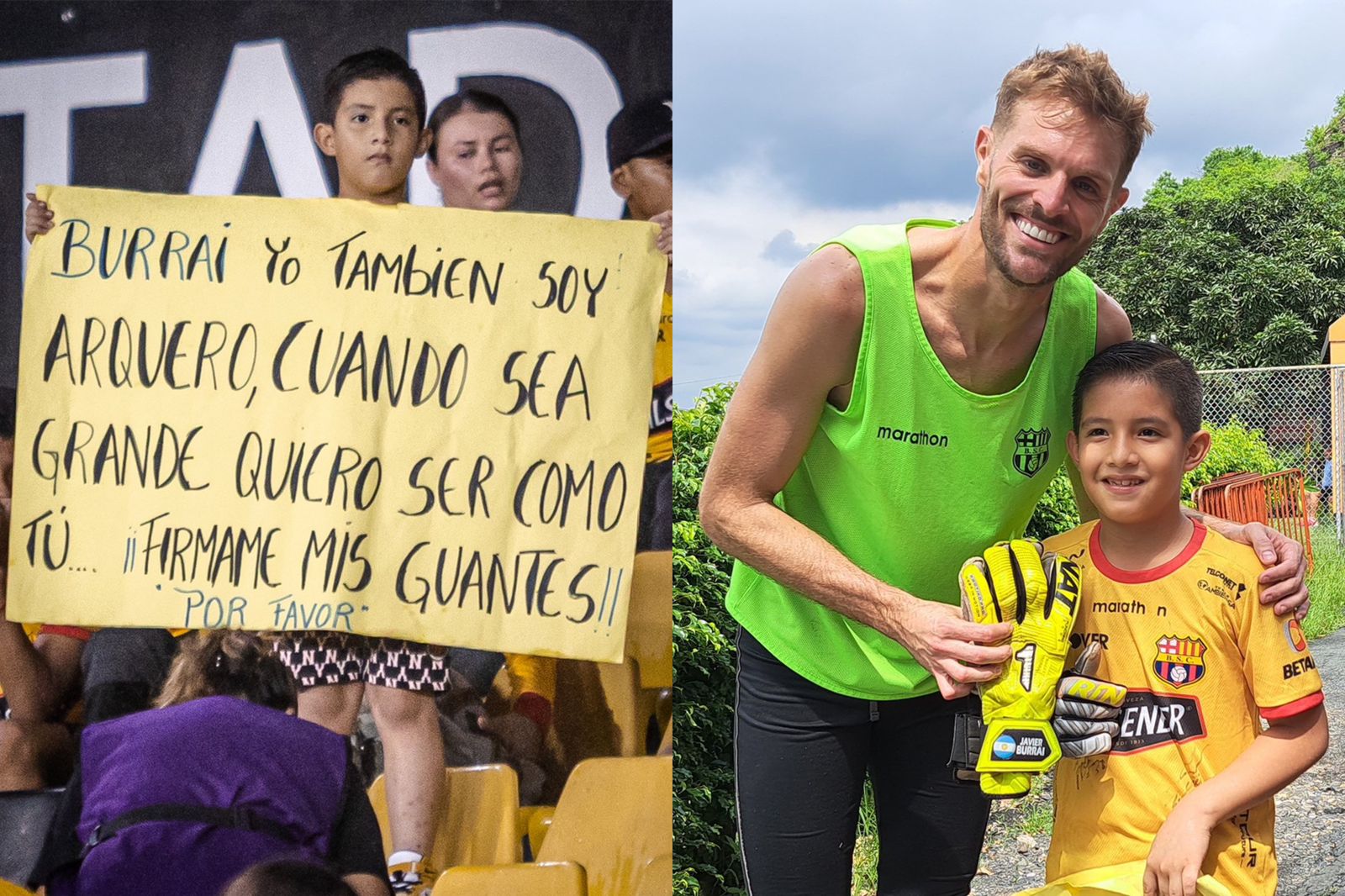 Y es que durante el cotejo entre los ‘Amarillos’ y Cumbayá, Damián Sellán mostró una pancarta con el siguiente texto: “Burrai, yo también soy arquero. Cuando sea grande quiero ser como tú… ¡Fírmame mis guantas, por favor!”.