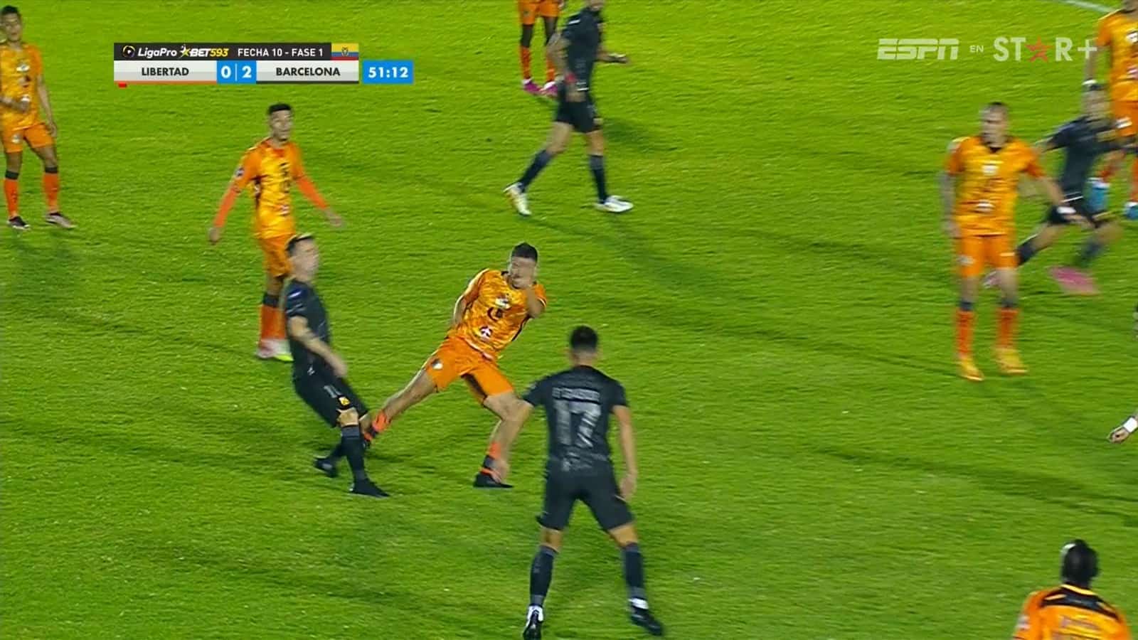 tras revisión del VAR, Roberto Sánchez rectificó y decidió la roja directa para Pedro Larrea (1ra expulsión en LigaPro 2023, 11 en Serie A tras 419 PJ), Libertad se quedó con 10 jugadores.