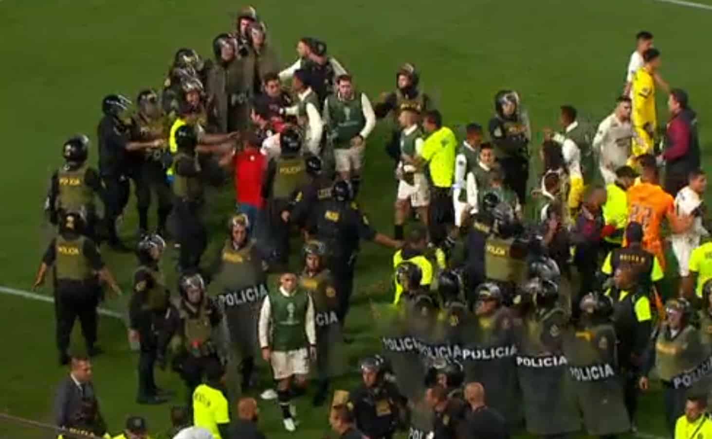 Sin embargo, los policías ingresaron al campo de juego para intentar separar y terminaron por también tener un cruce con los futbolistas cremas.