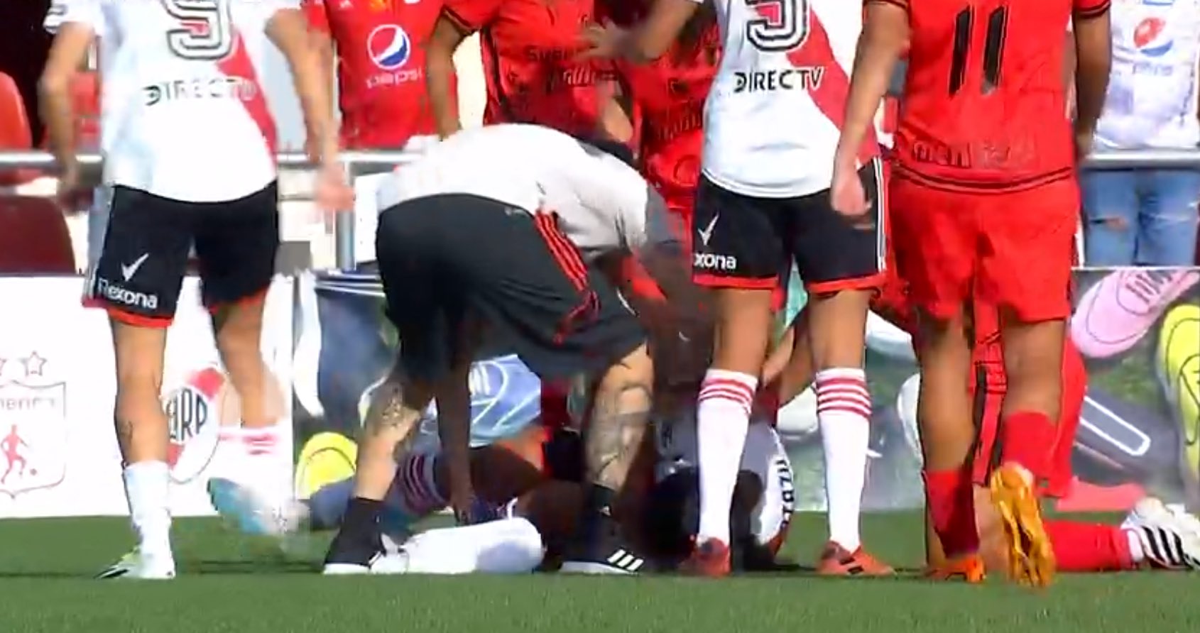 Tanto las jugadoras de River como las de América se ubicaron para tapar la escalofriante imagen que conmocionó a todos los presentes. De hecho, algunas de sus compañeras no lograron contener las lágrimas.