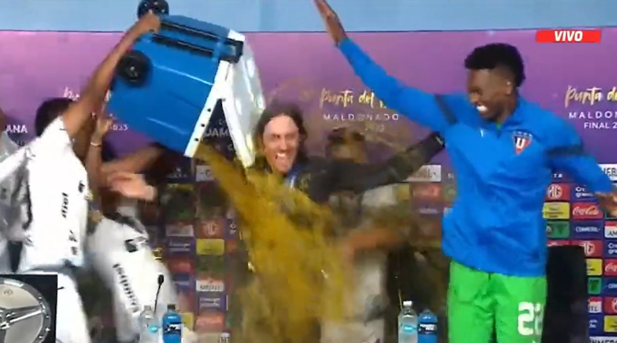 En plena rueda de prensa post partido, los jugadores invadieron la sala para ‘bañar’ a su DT, Luis Zubeldía, y continuar celebrando su quinta estrella internacional.