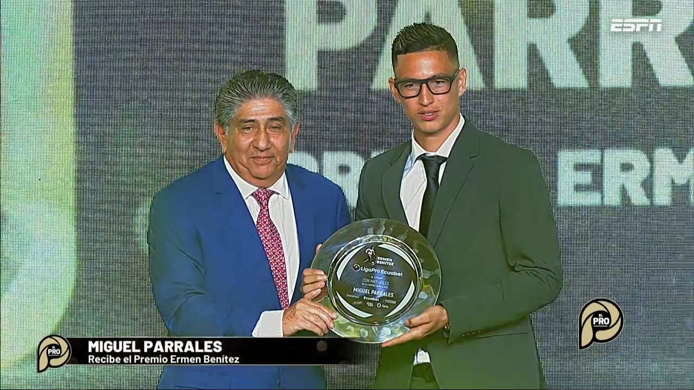 Miguel Parrales fue premiado por ser el mayor anotador de la LigaPro 2023 y se le otorgó el premio  ERMEN ‘LA PANTERA’ BENÍTEZ.