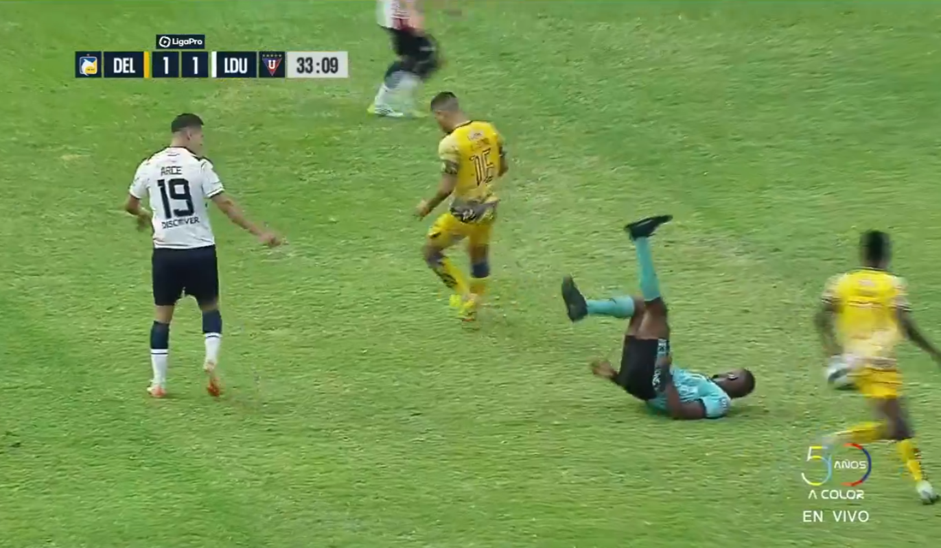 El Delfín vs. Liga de Quito nos dejó una imagen por demás curiosa, cuando en medio del desarrollo del partido el goleador Alex Arce se llevó por delante al juez central.