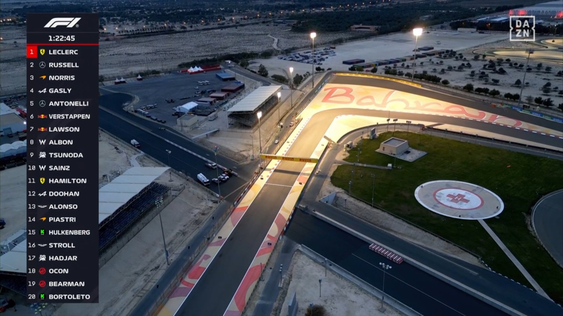 El desconcierto se prolongó por unos 40 minutos antes de que parte de la iluminación del trazado regresara. Sin embargo, al caer la noche en Bahréin, aún quedaban zonas sin iluminación suficiente para garantizar la seguridad en pista. A falta de poco más de una hora para el final de la jornada, el coche de seguridad salió a evaluar la situación, pero la pérdida de tiempo ya estaba consumada.