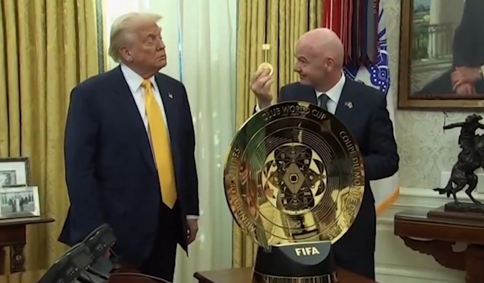 El presidente de la FIFA, Gianni Infantino, mostró a Donald Trump, en la Oficina Oval, el trofeo y el balón oficial del Mundial de Clubes que inicia el próximo 14 de junio, en Miami, Florida.