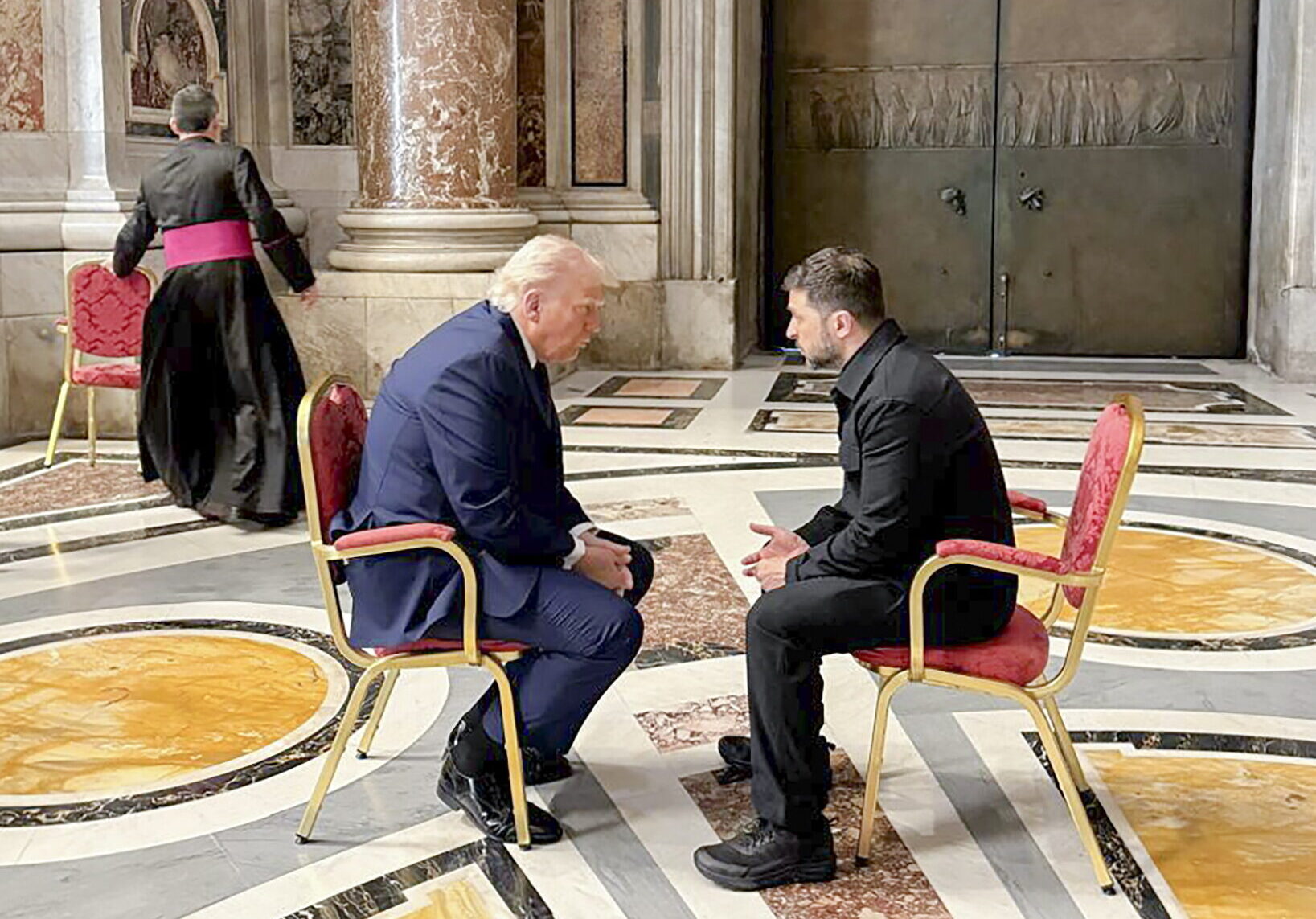 El diálogo ha durado unos 15 minutos, y ha dejado una imagen para la posterioridad, ambos líderes sentados frente a la Basílica de San Pedro, uno frente al otro, con un cardenal de fondo. Es la primera vez que ambos líderes se vuelven a reunir tras su acalorada discusión en la Casa Blanca.