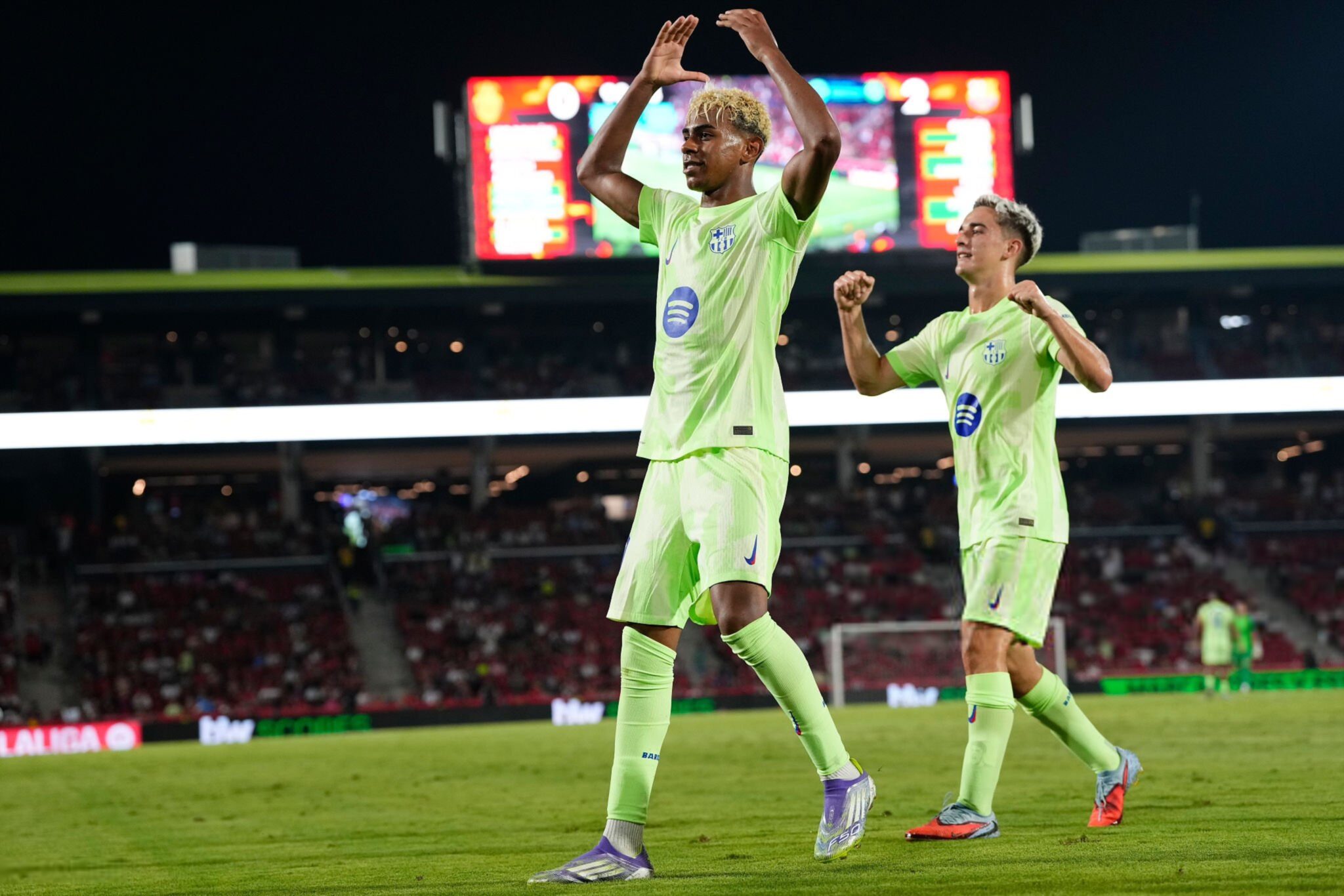 La situación para Mallorca se complicó aún más con las expulsiones de Manu Morlanes (minuto 33, por doble amarilla tras una falta sobre Yamal) y Vedat Muriqi (minuto 39, tras una roja directa revisada por el VAR por un pisotón al debutante portero Joan García). Con nueve jugadores, el equipo local se vio superado y apenas pudo resistir el dominio blaugrana.