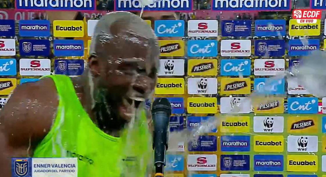 Luego del triunfo de Ecuador por 1-0 ante Argentina en Guayaquil, Enner Valencia vivió un momento especial durante la entrevista post partido. Mientras respondía a los medios, sus compañeros lo bañaron en plena celebración, reflejando la alegría del equipo tras cerrar las Eliminatorias con una victoria.