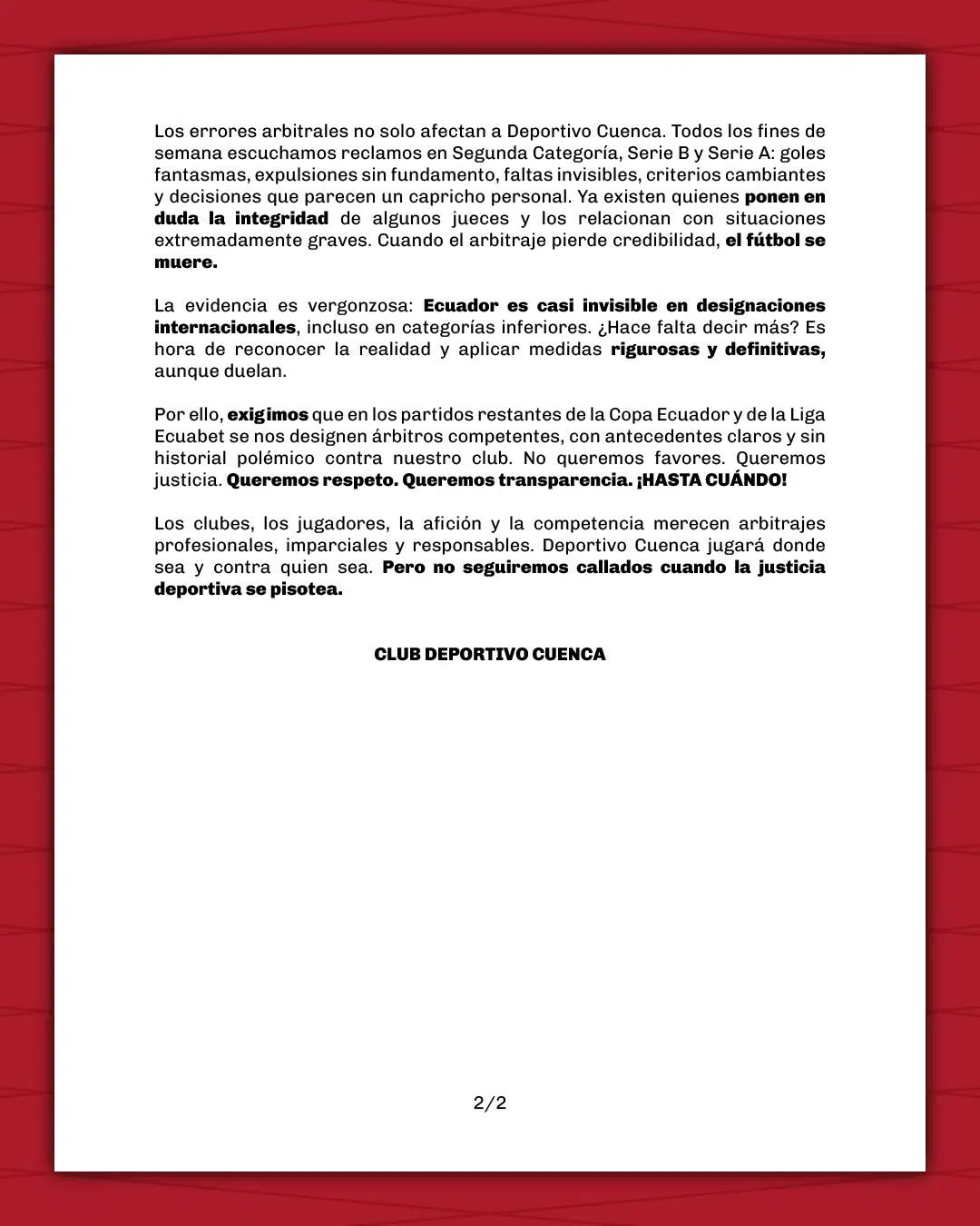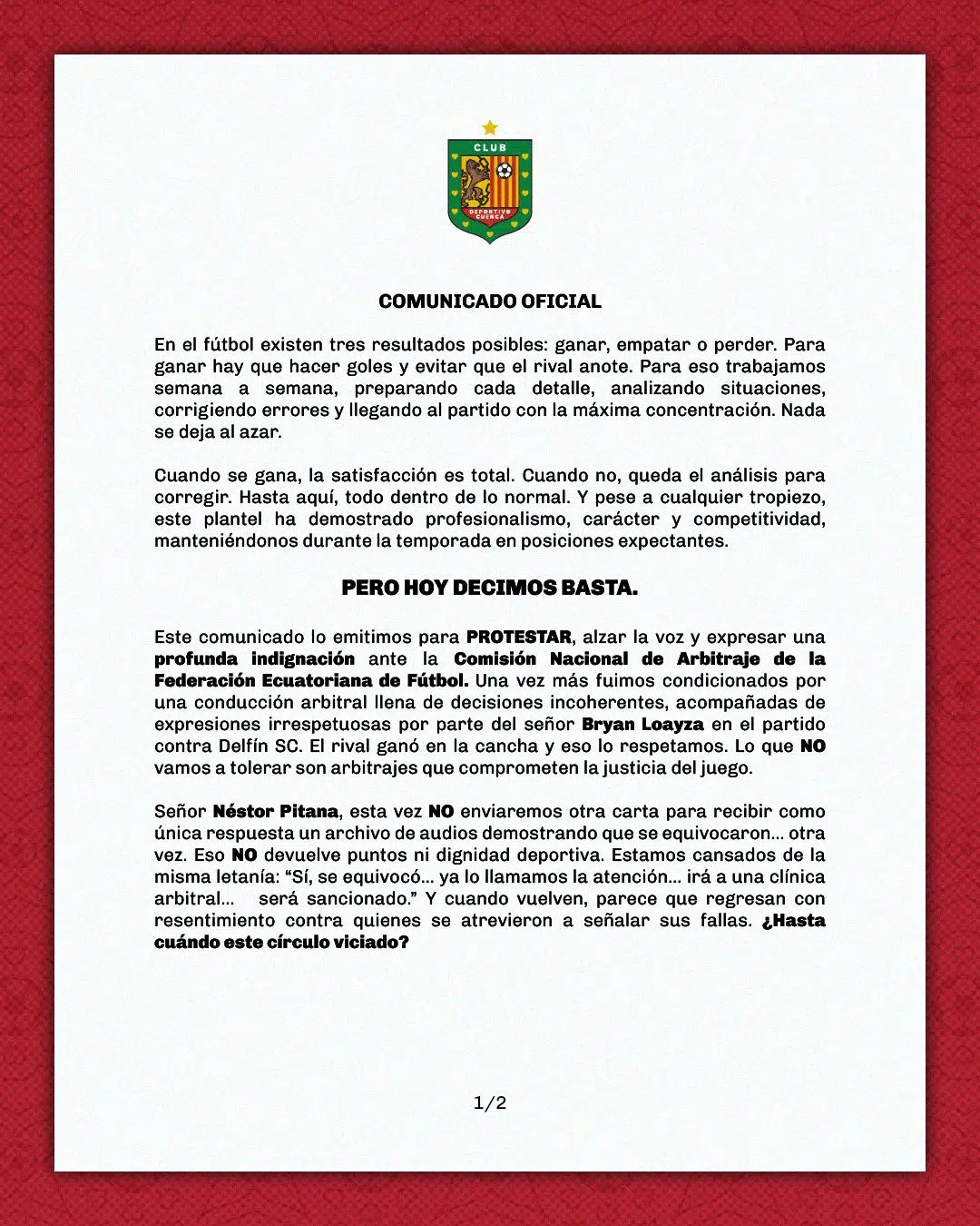 El Deportivo Cuenca ha lanzado un fuerte y contundente comunicado dirigido a la Comisión de Arbitraje de la Federación Ecuatoriana de Fútbol en protesta a lo que fue la actuación de la terna en el duelo ante el Delfín en el Jocay.