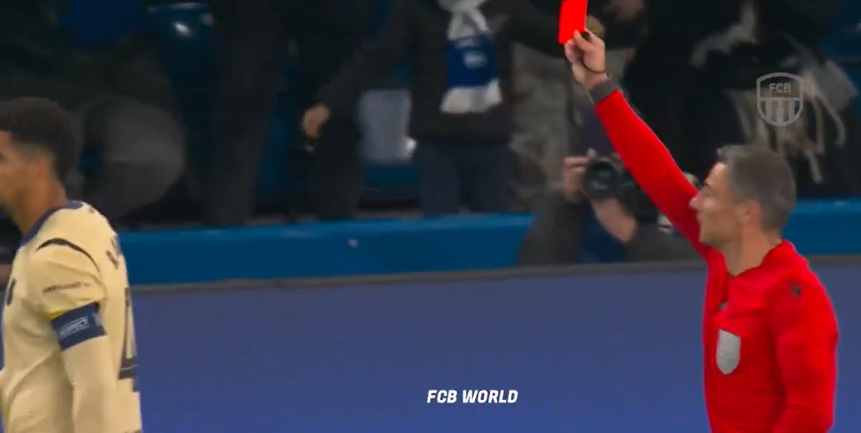 La segunda amonestación llegó en una acción dividida en la que el central llegó tarde, dejando al conjunto azulgrana con 10 jugadores antes del descanso en un partido clave de la fase eliminatoria.