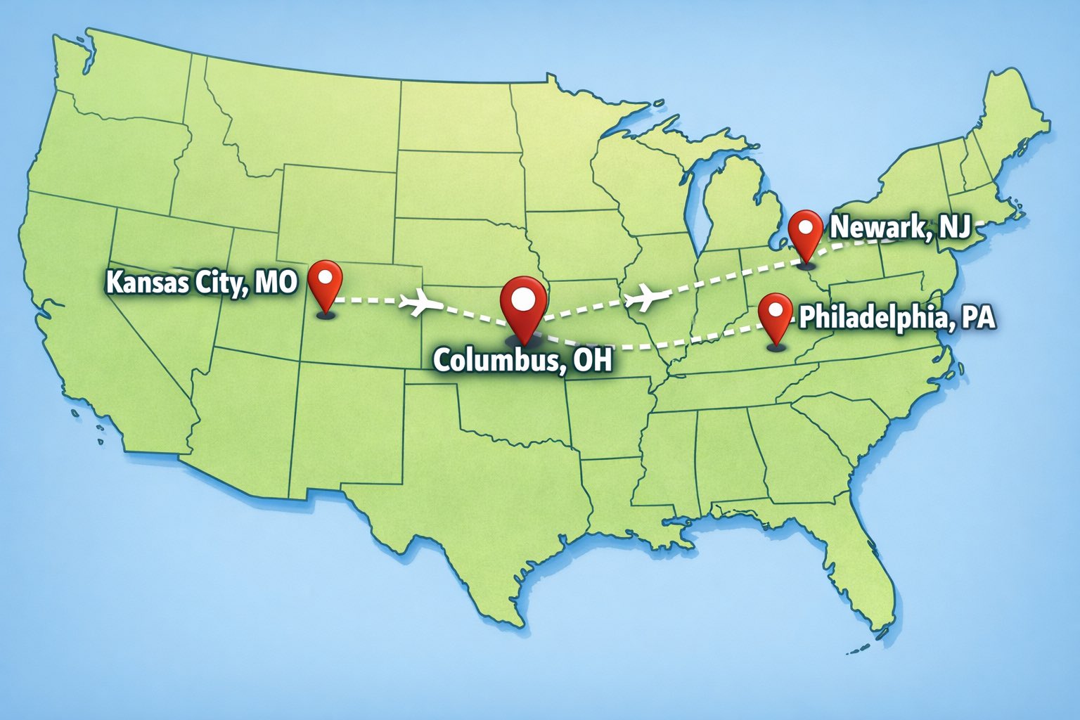 • Vuelo directo aprox. 1 hora 20 minutos✈️ Columbus → Kansas City