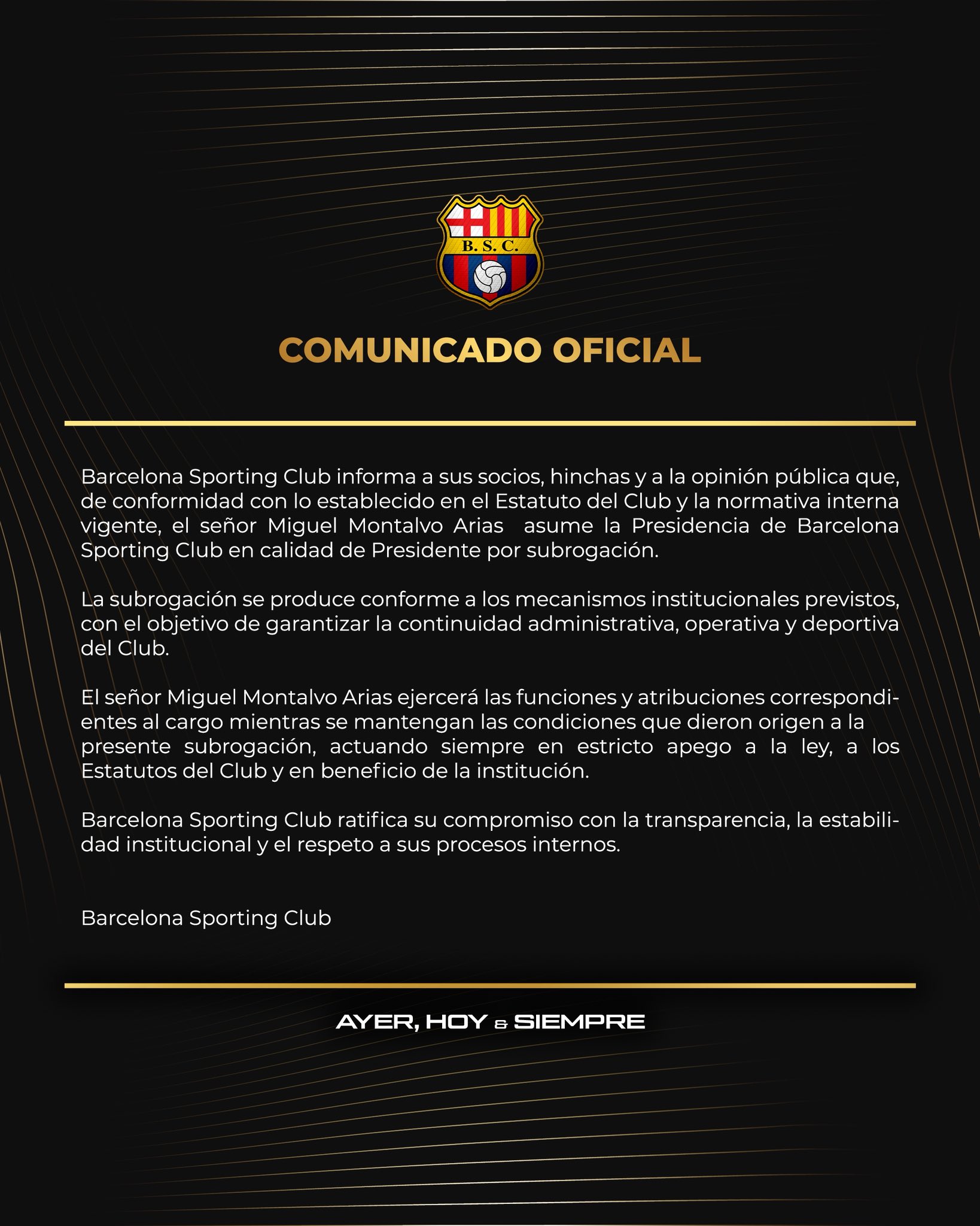 Montalvo, quien es parte del directorio de Barcelona SC, tomará el control administrativo del equipo con el objetivo de mantener la estabilidad institucional y deportiva en uno de los clubes más representativos del país bajo la figura de “presidente por subrogación” .