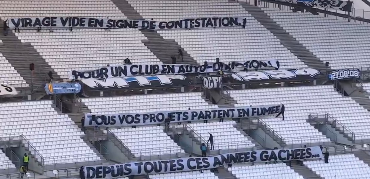 TRIBUNA VACÍA: los hinchas de Olympique de Marsella y un mensaje claro para el dueño del club Frank McCourt por la situación que atraviesa la institución en el duelo vs. Estrasburgo