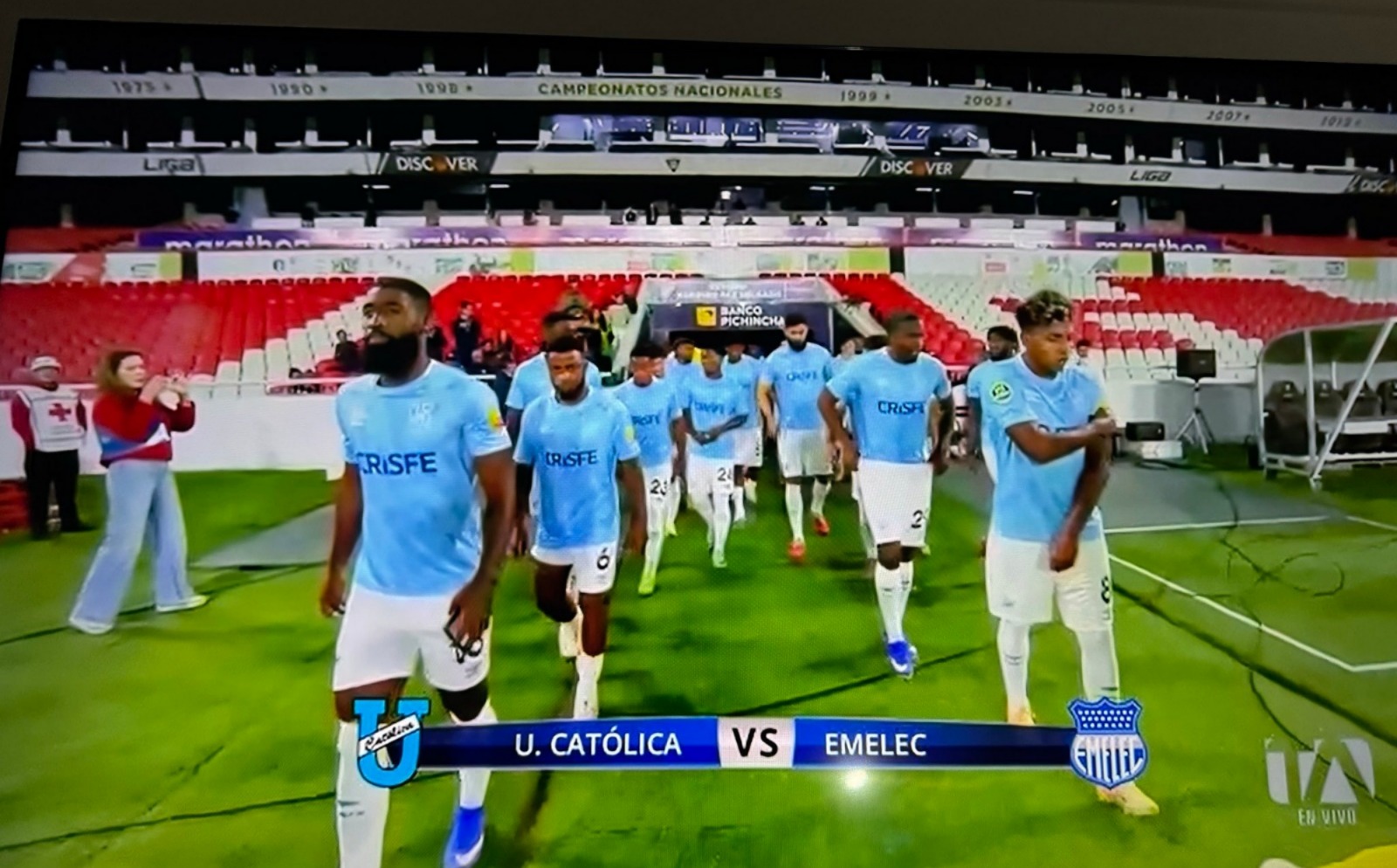 La Universidad Católica demostró su firme rechazo a la decisión de la LigaPro de reprogramar el partido correspondiente a la Fecha 1 de la Liga Ecuabet 2026 ante Emelec. A pesar del anuncio oficial del organismo rector, que justificó la postergación por una supuesta “causa de fuerza mayor relacionada con la seguridad”, el club ‘camaratta’ se presentó con total normalidad en el Estadio Rodrigo Paz Delgado este sábado 21 de febrero. Jugadores, cuerpo técnico y directivos cumplieron con el horario originalmente establecido, saltaron a la cancha y esperará los 30 minutos reglamentarios en señal de protesta, mientras la transmisión se mantenía activa sin la presencia del rival.